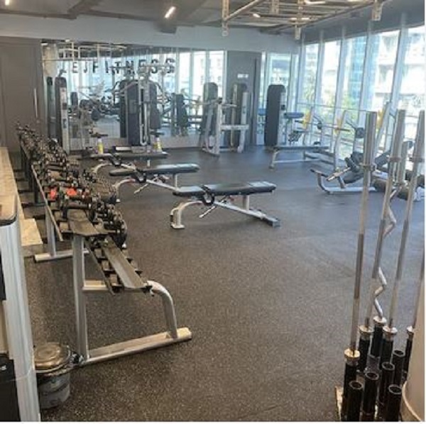 - Setup: Strength floor with dumbbells, benches, squat racks, cables, and cardio machines